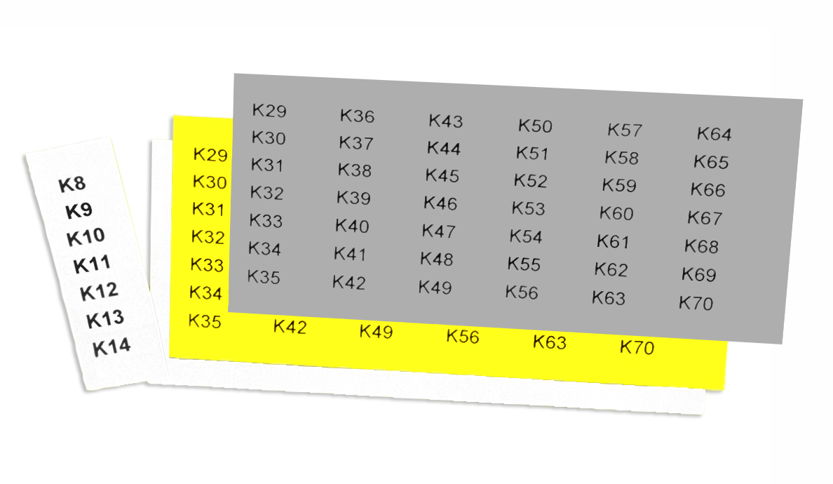 Self-adhesive legends for tag holders and push button holders. Also used for different duct series and fits Siemens Sirius 3R.
