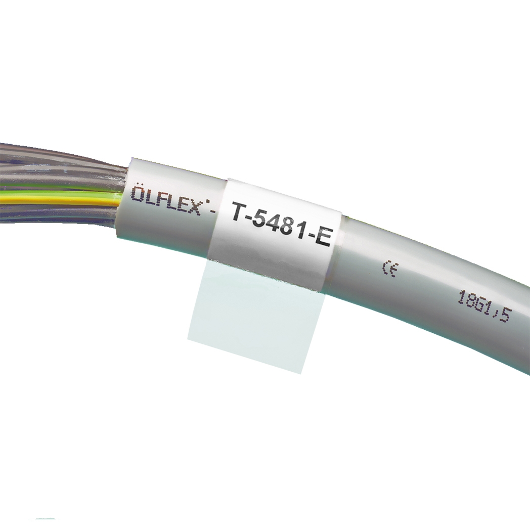 Kabeletikett för kabel och rörmärkning formgiven för CAB och EOS termotransferskrivare. Levereras på rulle, där märkningen skyddas av transparent folie.