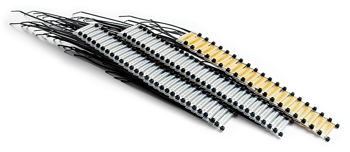 För snabb och effektiv märkning av kablar och rör. Full valfrihet av bokstäver, siffror och symboler på en eller två rader. Levererars monterad i plastprofil med buntband, sorterad enligt din order, på papplinjal.